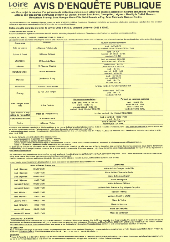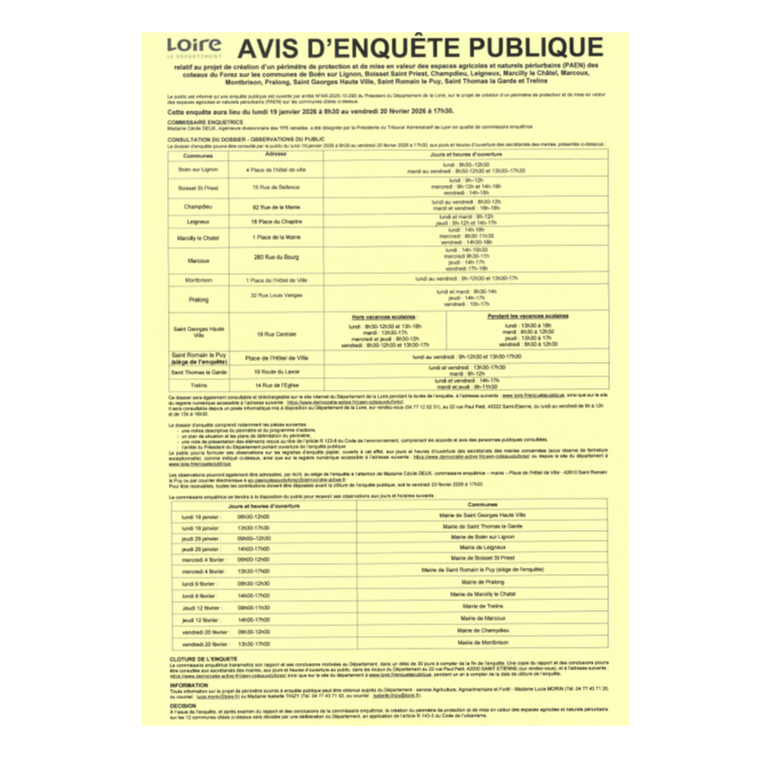 Une enquête publique est ouverte du lundi 19 janvier 2026 à 8h30 au vendredi 20 février 2026 à 17h30, sur le projet de création d’un périmètre de protection et de mise en valeur des espaces agricoles et naturel périurbains (PAEN) sur les communes de Boën sur Lignon, Boisset Saint Priest, Champdieu, Leigneux, Marcilly le Châtel, Marcoux, Montbrison, Pralong, Saint Georges Haute Ville, Saint Romain le Puy, Saint Thomas la Garde et Trelins.